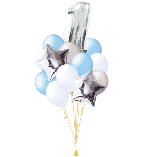 2 шт метровых цифр (107 см) +2 шт метровых шаров с конфетти и с бахромой +2 фонтана по 6 шт хромированных+ 3 шт обычных+3 шт звезды из фольги . Цвет/количество по вашему желанию.